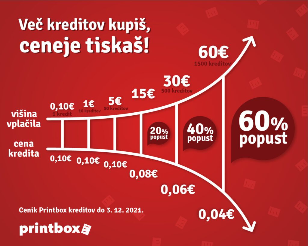 Cenik Printbox kreditov bomo spremenili 3. 12. 2021. Do 2. 12. 2021 bo veljal obstoječi cenik Printbox kreditov. V nadaljevanju prikazujemo oba cenika Prinbox kredita: obstoječega kakor tudi novega, ki bo veljal od 3. 12. 2021 dalje.