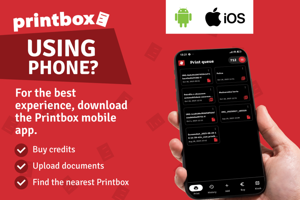 With the Printbox mobile app, you can manage printing, credits, and kiosks quickly and effortlessly — anytime, anywhere.
