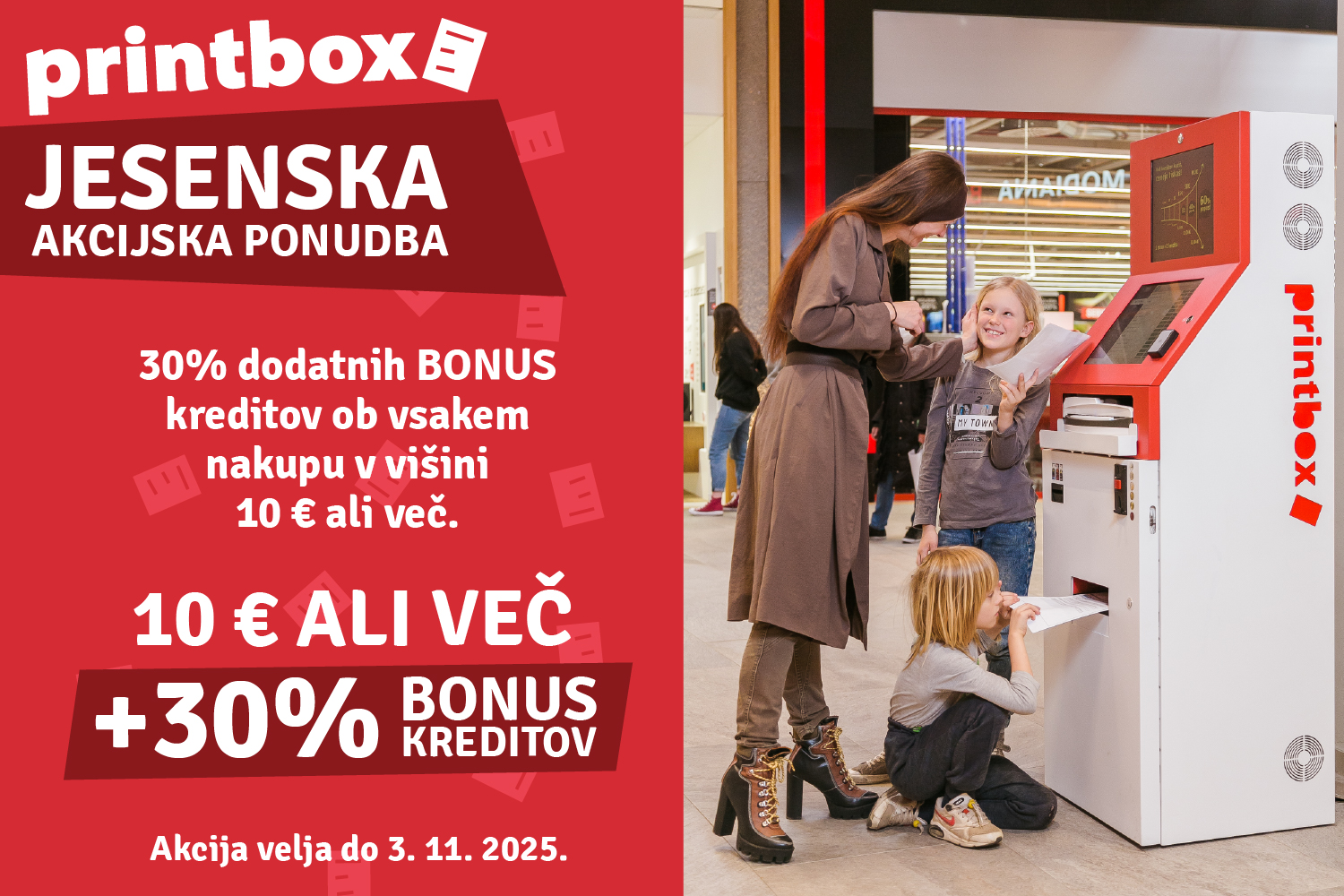 Printbox – Jesenska akcijska ponudba do 3.11.2025. Prejmi 30% več kreditov za vsa vplačila v višini 10 EUR ali več.